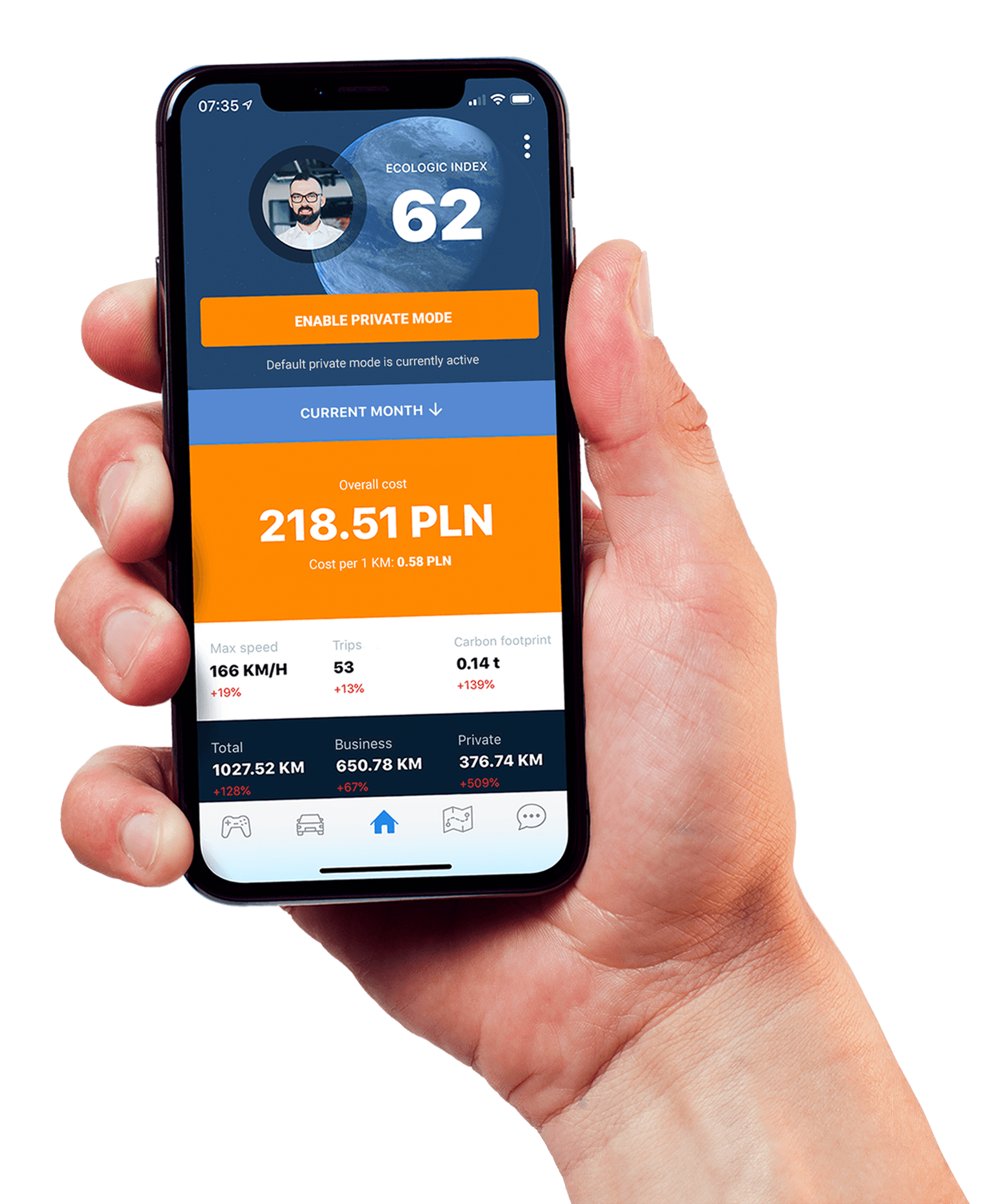 The hourly schedule and driving mode detection system enable automation of repetitive work. An automated process that enables the cost of using the car for an employee’s private purposes to be legally deducted. The hourly schedule will automatically qualify trips as private if they are taken within a certain time period. Thanks to the import of leaves and absences of employees, you can be sure that all private routes are correctly marked. Ecologic can automatically mark private trips taken on all public holidays. The system will recognise when the driver has gone abroad and will apply a special rate per km, which doesn’t include fuel. The system will charge the employee for private trips according to the rate determined by their driving style in a given month. Each employee may receive a pool of free kilometres, after which they will be charged according to specified rules. Ecologic will automatically detect and mark trips from home to work and from work to home. The system will automatically indicate additions to income, taking into account the days on which the employee used the car. The mobile application is the driver’s personal fleet assistant. The employee has up-to-date insight into all routes travelled, their cost and statistics regarding their driving style. The driver also has the option to manually mark routes as private. The driver can activate the private mode at any time for the next route, until the end of the day or until a selected date. If a Saturday, business trip is marked as private, just open the application and change the route to business trip with two clicks. Accounting for private use of cars